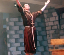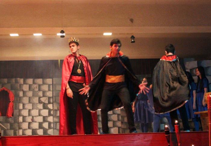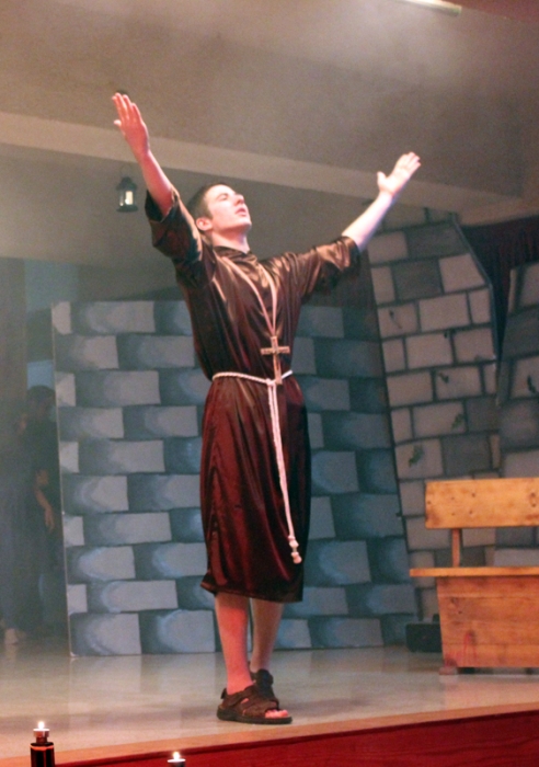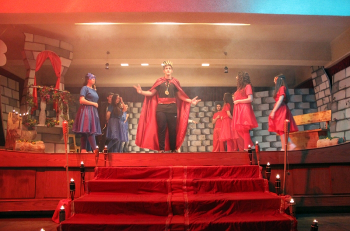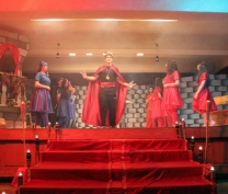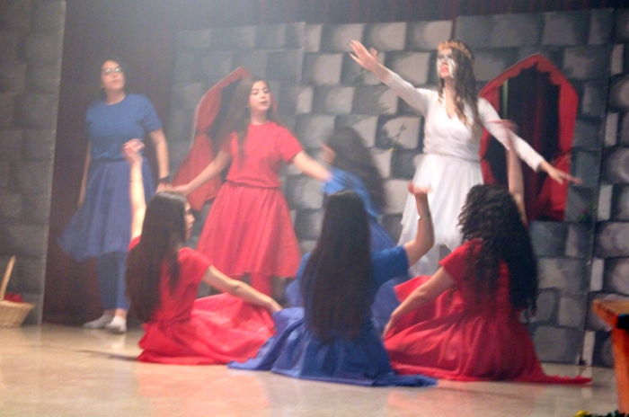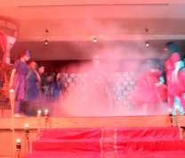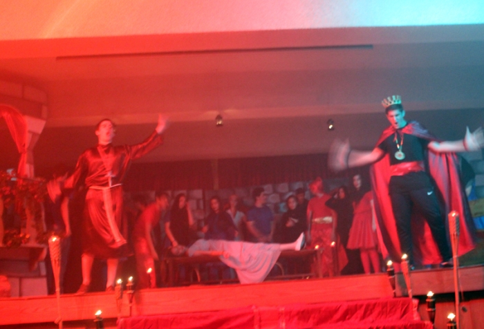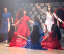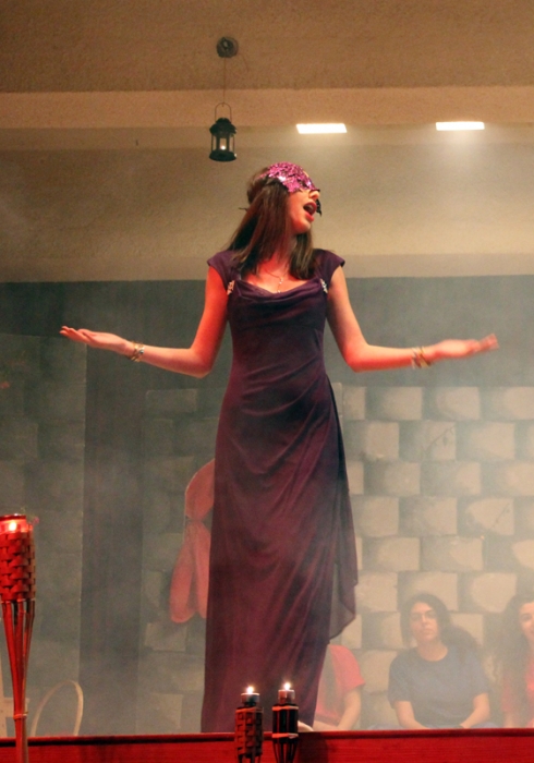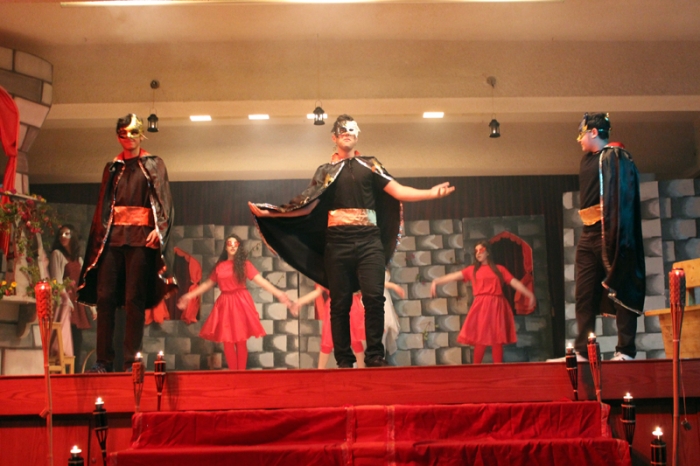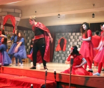 It was finally performed, to thunderous accolades from the audience: "Romeo and Juliet" was a smash hit! Romeo was Dori Fares, Juliet was Lea Tenn, Friar Lawrence was Bryan Powell, the Prince was Mark Moussan, Tybalt was George Saab, Mercutio was Karim Rawda, the sprite (Fate?) was Yana Rossoshanskaya. The musical was directed by Ms Wilma. Kindly check our Newsletter for more. A note on the pictures: The pictures are often fuzzy because of the fog effects onstage. |